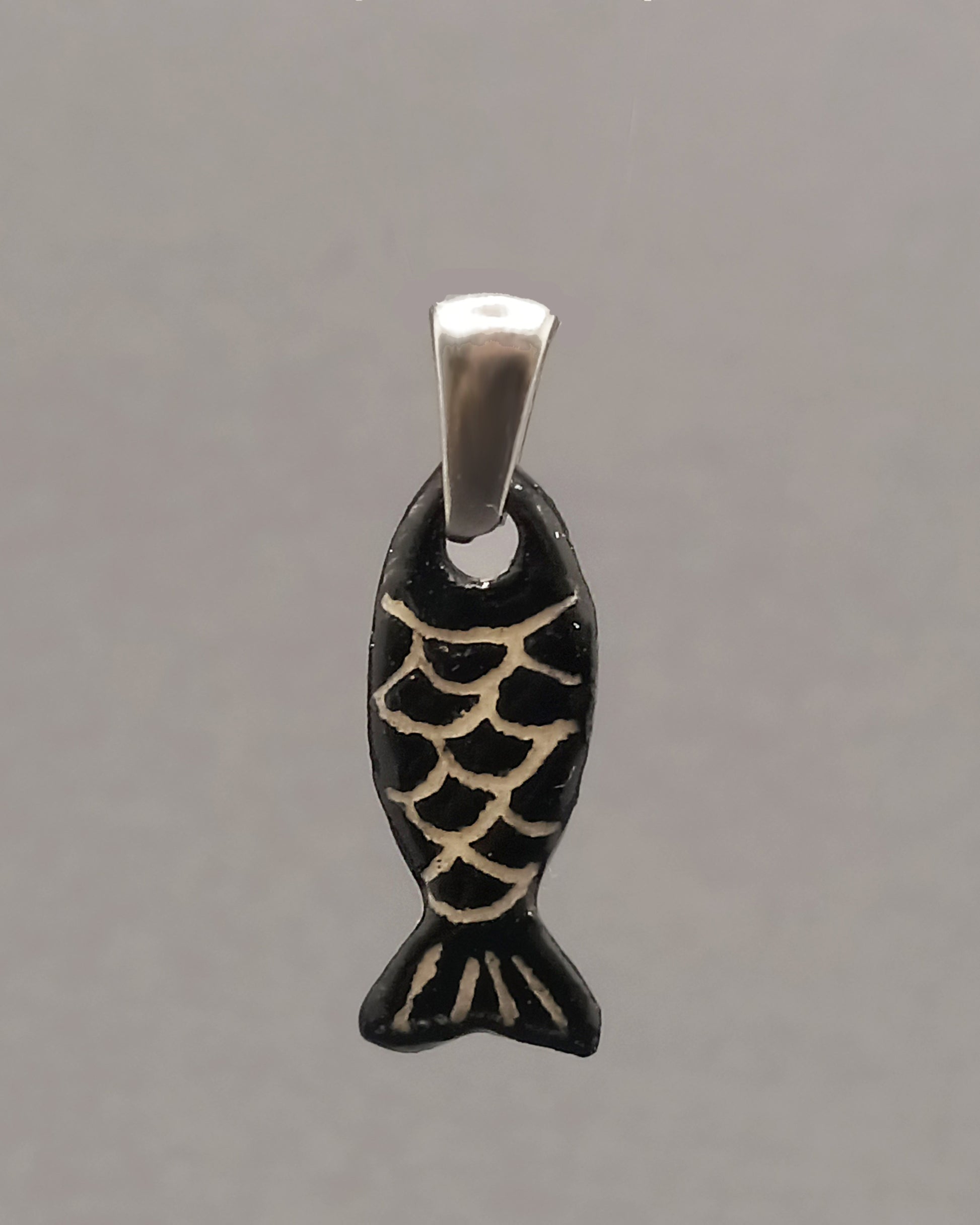 Pendente Peixe Preto em cerâmica artesanal pintada à mão. Ideal para colares, joia única que combina design simples e autêntico.